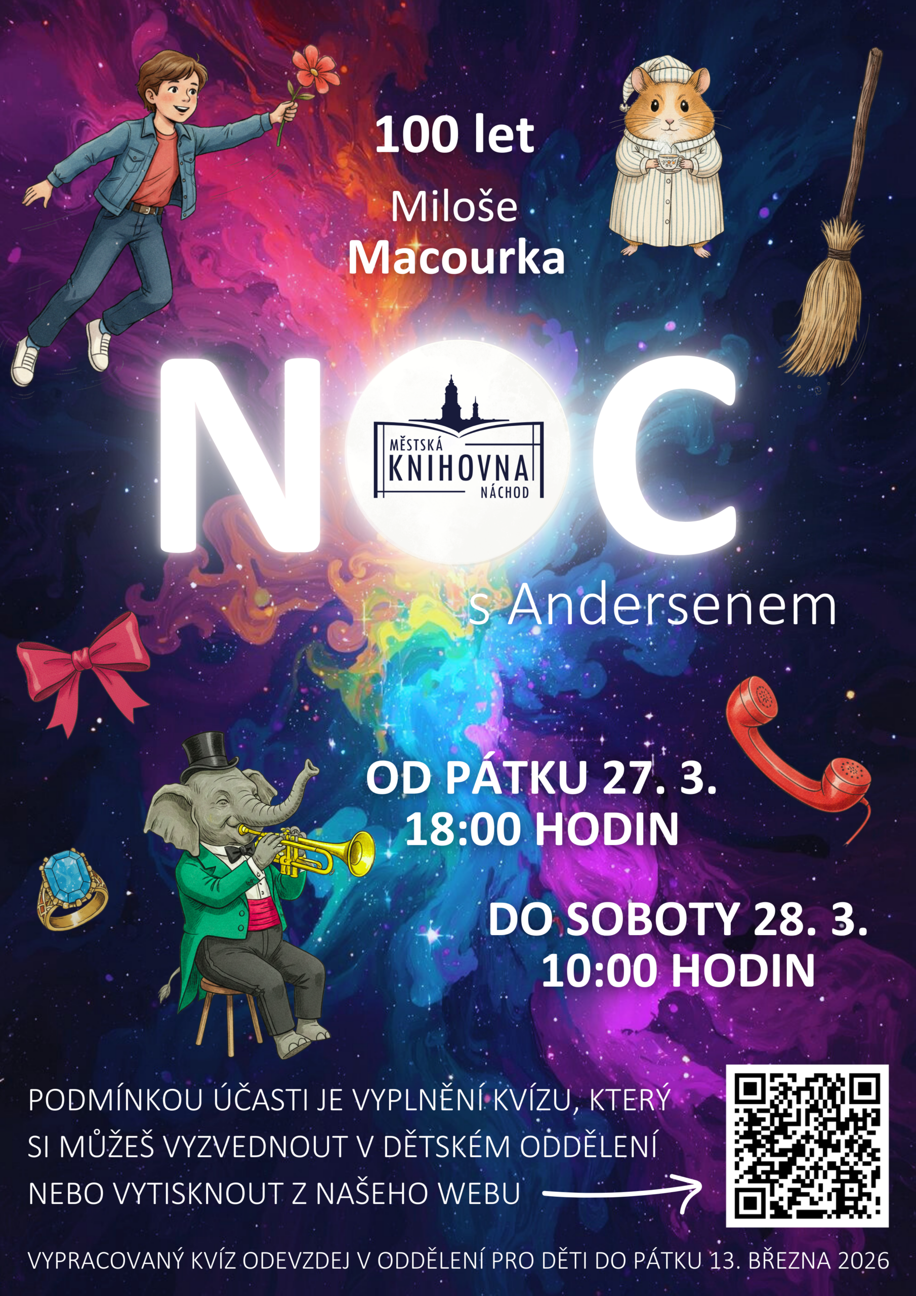 Dětské oddělení zve děti ve věku 8 – 12 let na Noc s Andersenem, která se uskuteční v pátek 27. března 2026. Čeká nás večer plný čtení, her a dobrodružství v knihovně po zavírací době, zakončený společnou snídaní.